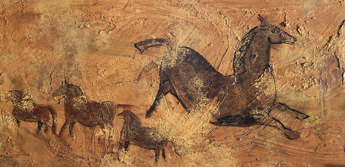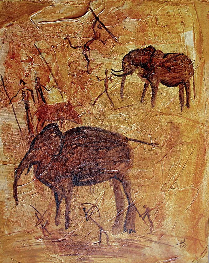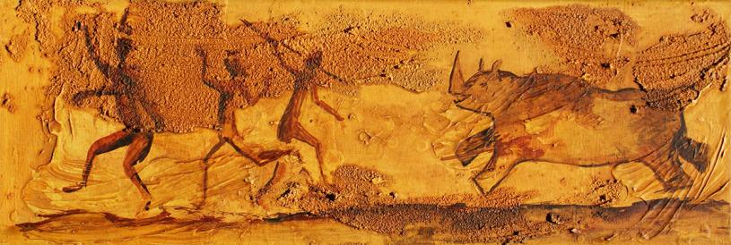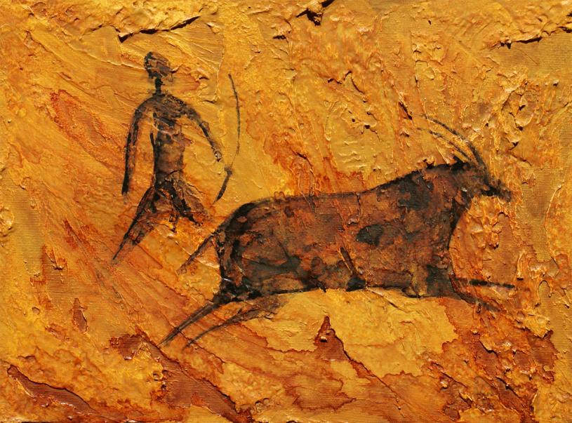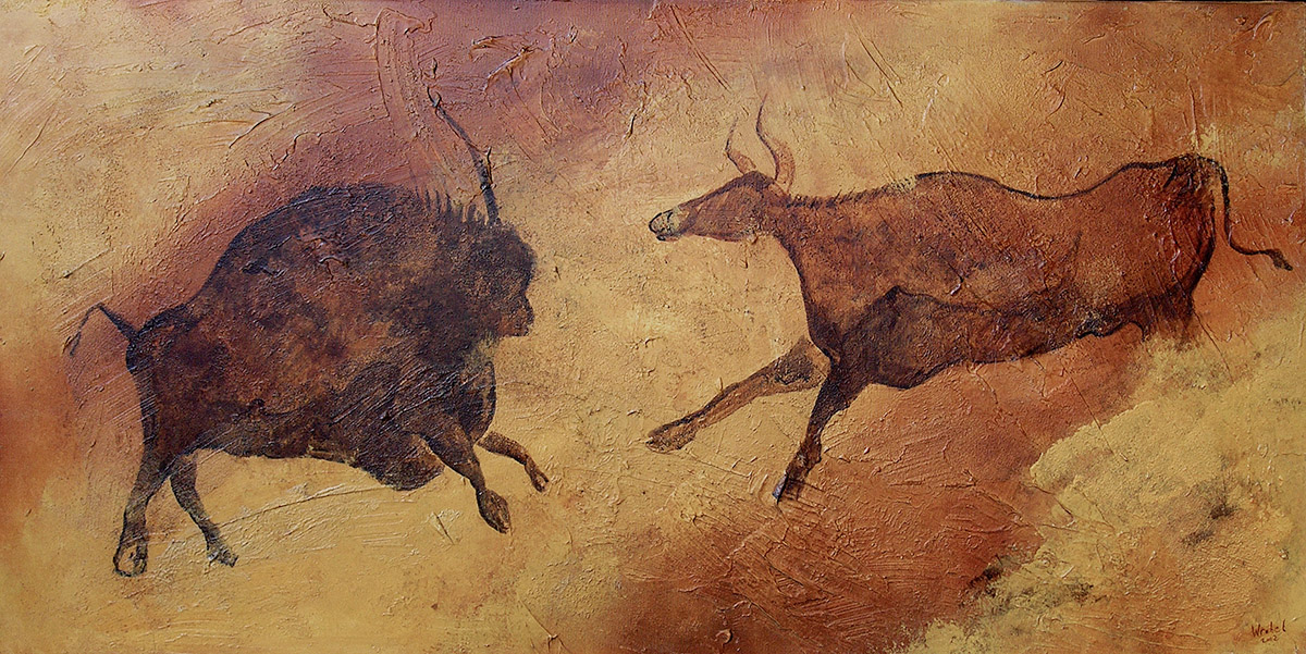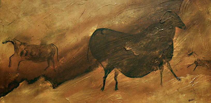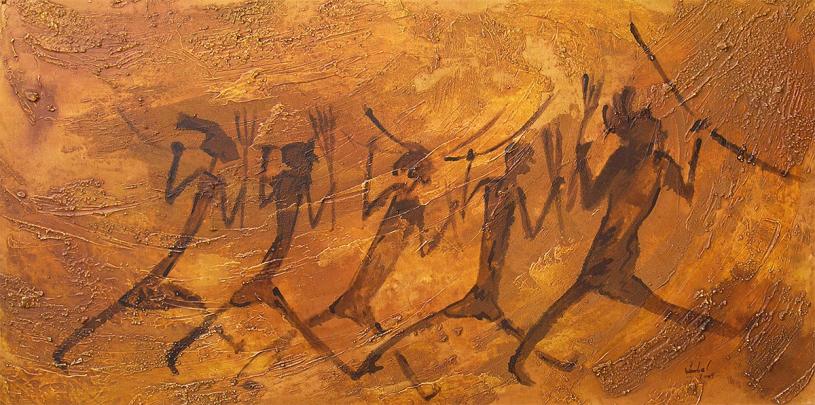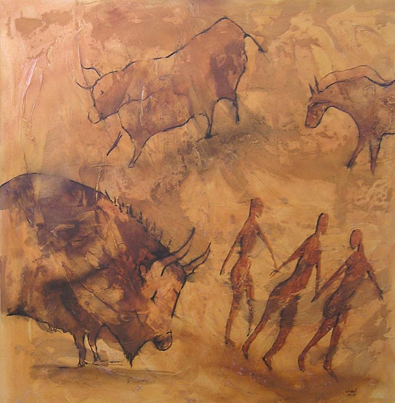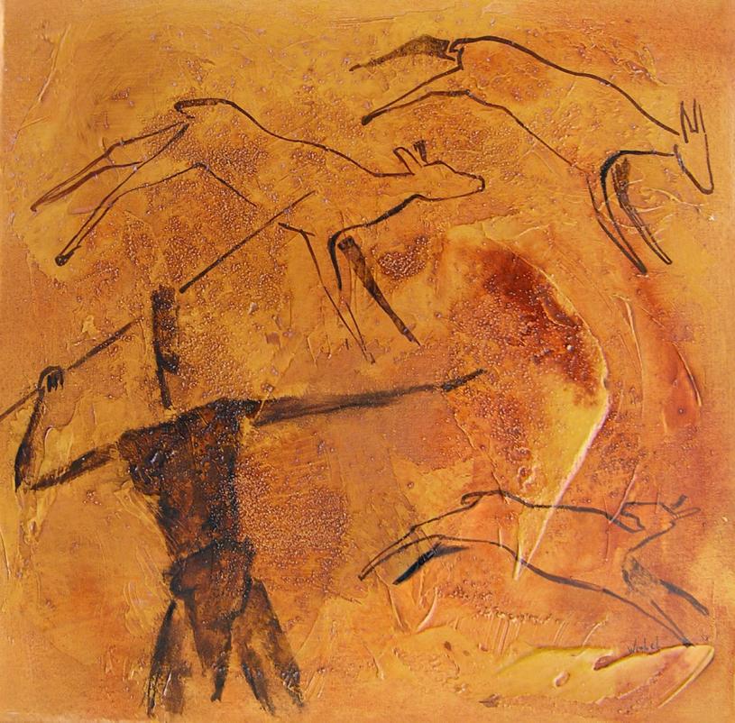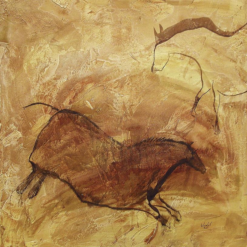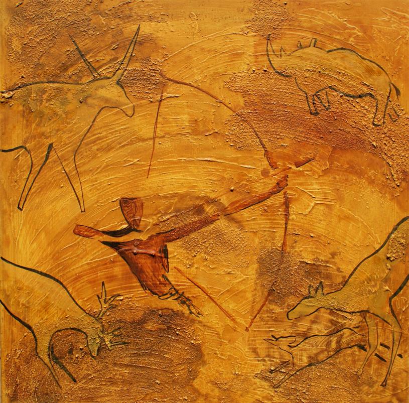 Die von prähistorischen Felsmalereien inspirierte Cave-Art Serie zeigt Darstellungen von Tieren und Menschen. Neben der Neuinterpretation authentischer Motive werden auch moderne Darstellungsformen und Techniken verwendet. Mit Sand und Strukturpaste wird ein unregelmäßiger Malgrund geschaffen, durch den die Bilder eine ganz eigene Note erhalten.