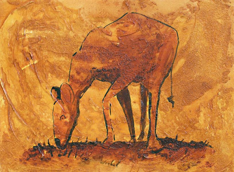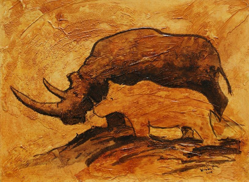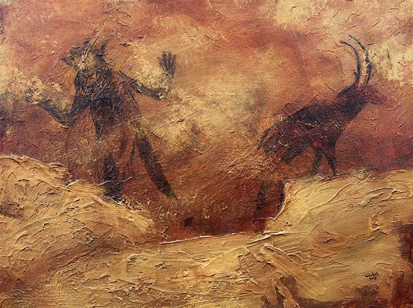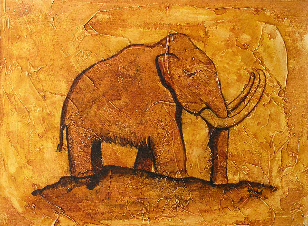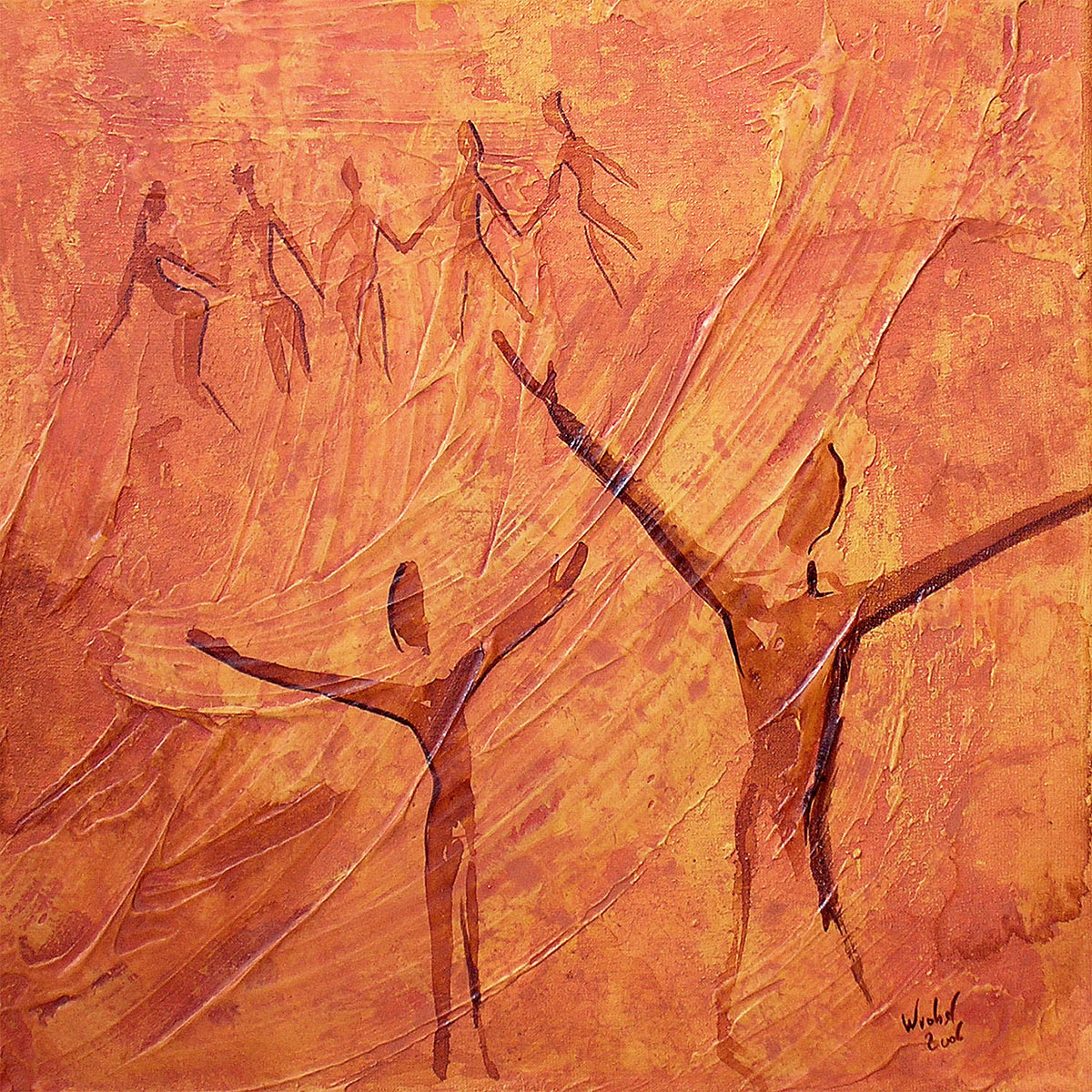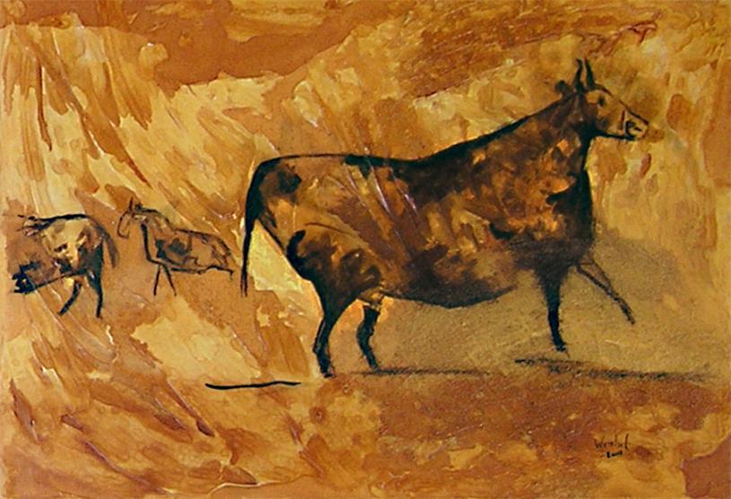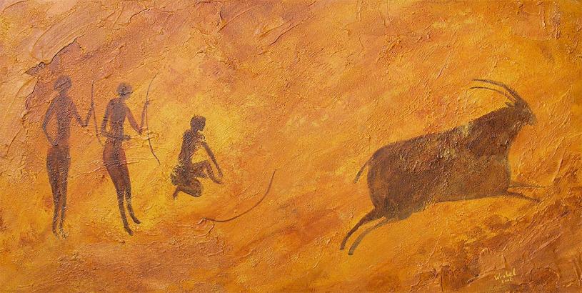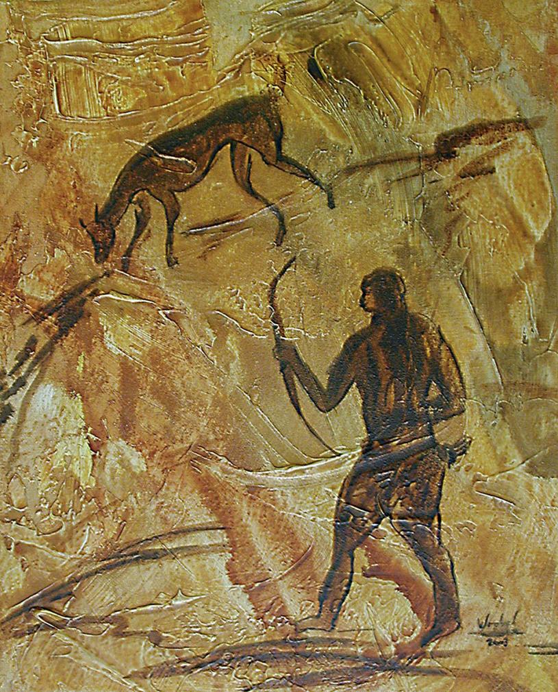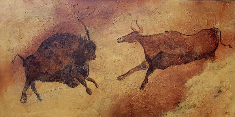 Die von prähistorischen Felsmalereien inspirierte Cave-Art Serie zeigt Darstellungen von Tieren und Menschen. Neben der Neuinterpretation authentischer Motive werden auch moderne Darstellungsformen und Techniken verwendet. Mit Sand und Strukturpaste wird ein unregelmäßiger Malgrund geschaffen, durch den die Bilder eine ganz eigene Note erhalten.