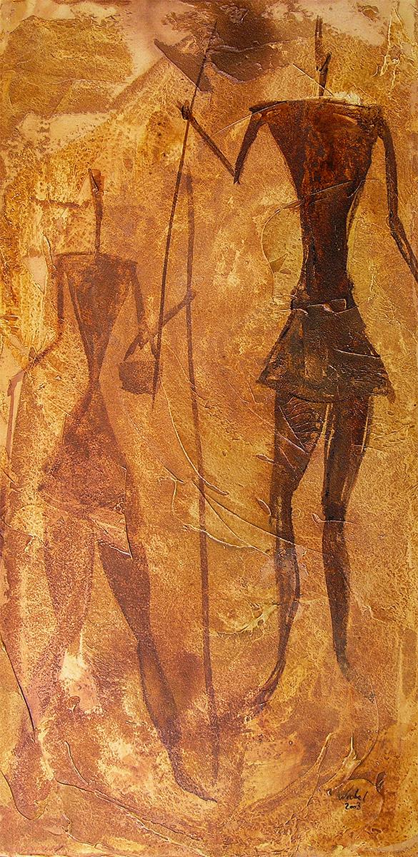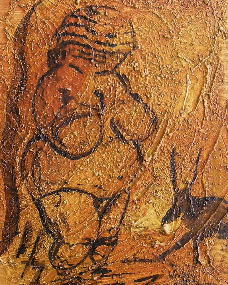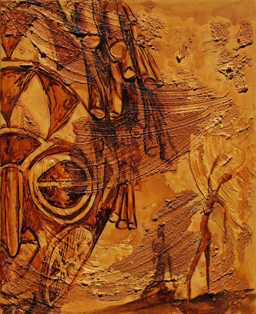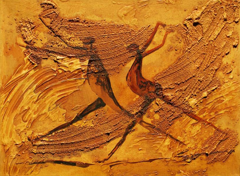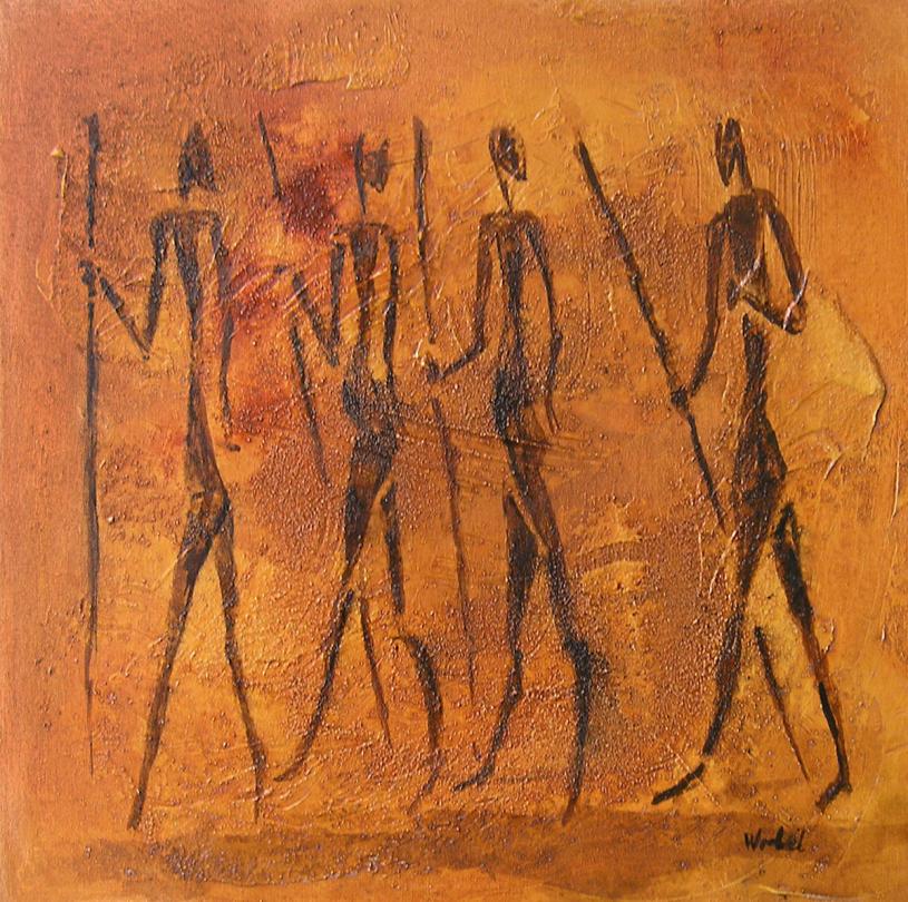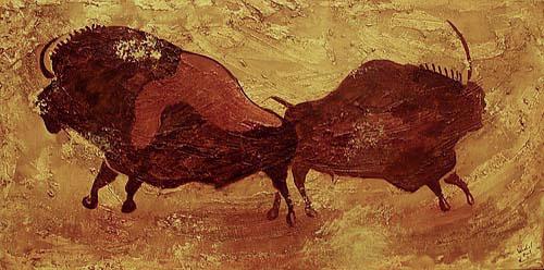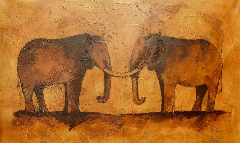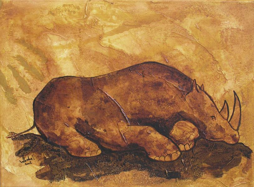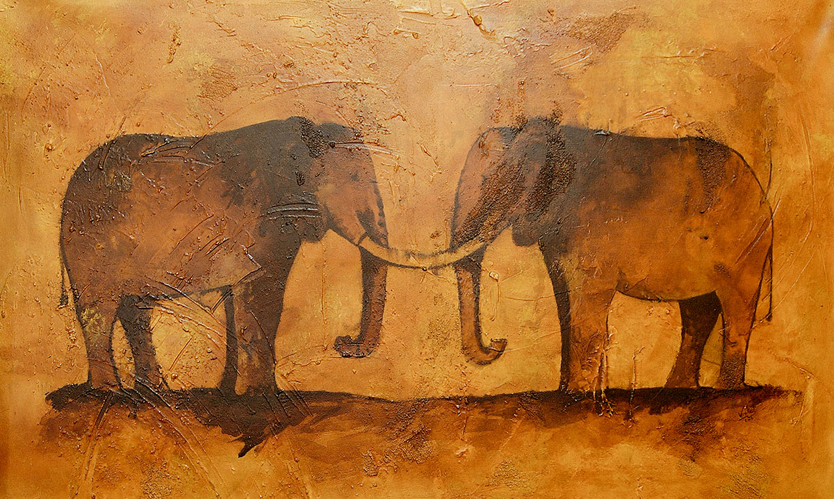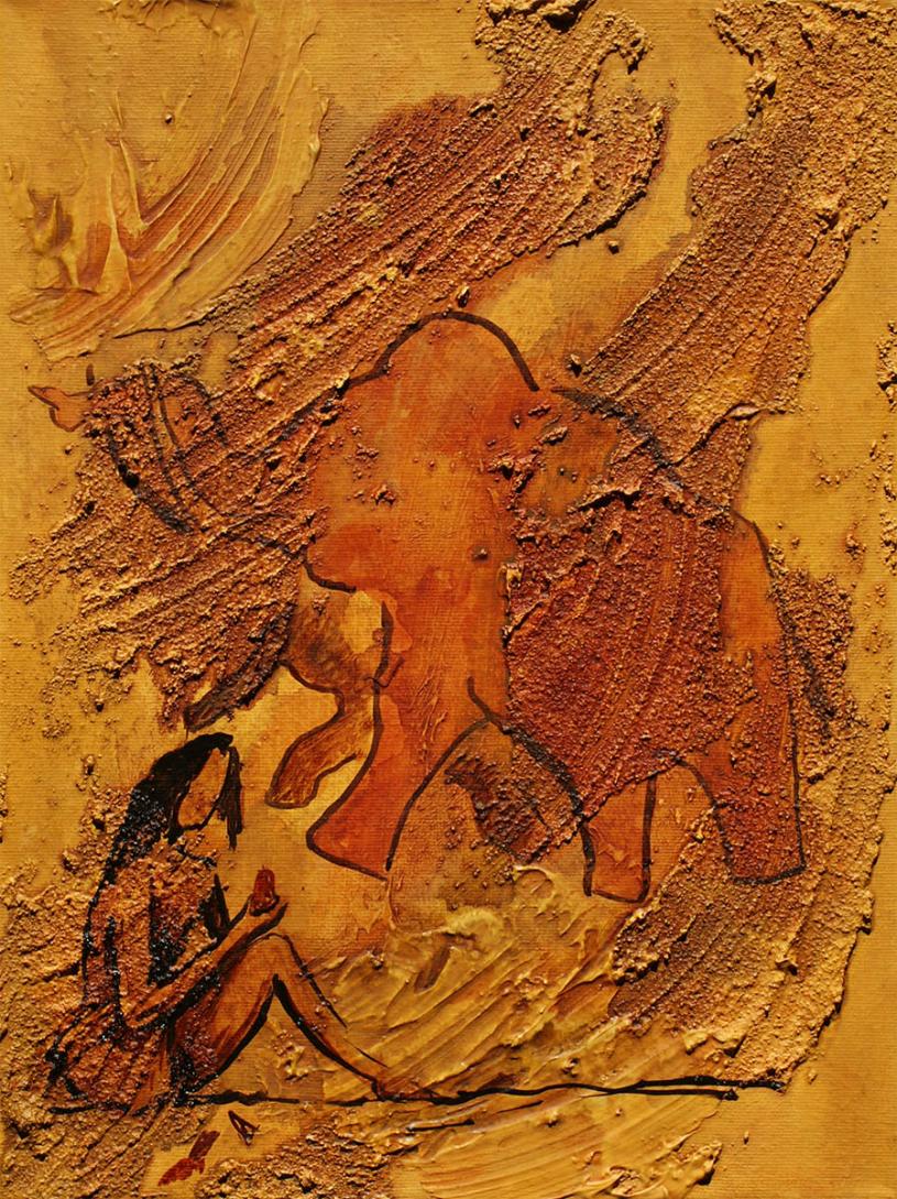 Die von prähistorischen Felsmalereien inspirierte Cave-Art Serie zeigt Darstellungen von Tieren und Menschen. Neben der Neuinterpretation authentischer Motive werden auch moderne Darstellungsformen und Techniken verwendet. Mit Sand und Strukturpaste wird ein unregelmäßiger Malgrund geschaffen, durch den die Bilder eine ganz eigene Note erhalten.